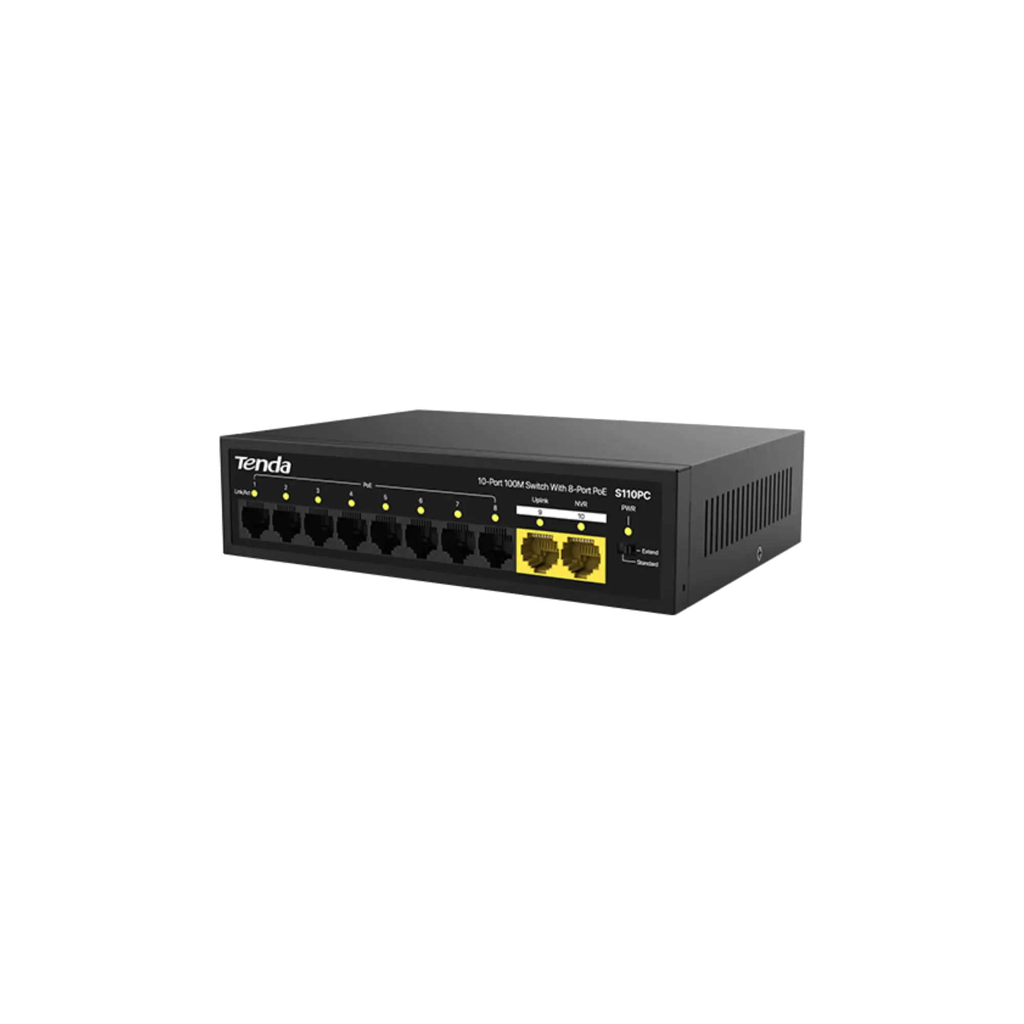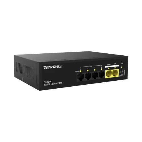 The Tenda S106PC is a compact 6-port 100Mbps PoE switch designed for small surveillance and networking setups. Featuring four PoE ports that support IEEE 802.3af, it can directly power IP cameras, access points, and VoIP phones without external adapters. With a 58W total PoE budget, it ensures stable and efficient performance. The two uplink ports allow smooth connection to NVRs or routers, making it ideal for CCTV installations. Its plug-and-play design requires no technical configuration, making installation fast and easy. With surge protection and steady output power, the S106PC is a reliable and cost-effective solution for small businesses.